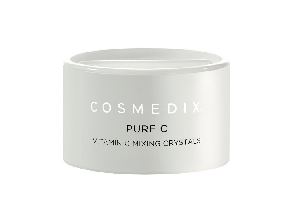 Cosmedix PURE C omlazující Booster Vitamin C (100% čistá kyselina L-askorbová ve formě krystalků) je unikátní omlazující booster ve formě suchého pudru. Při použití v kombinaci s jiným produktem neutralizuje volné radikály, snižuje výskyt jemných vrásek a upravuje texturu. Krystalické složení vitamínu C umocňuje účinek pleťových sér a produktů. Používá se pro zesílení omlazujících účinků jakéhokoliv z produktů péče o pleť pro ještě zářivější vzhled, ještě pevnější pleť a ještě větší redukci vrásek. Pokožka je jím vysoce stimulována k obnově a její textura i tonus se mění.